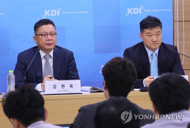 (세종=연합뉴스) 진성철 기자 = 김현욱 한국개발연구원(KDI) 경제전망실장(왼쪽), 정규철 경제전망실 전망총괄이 21일 세종시 정부세종청사 기획재정부에서 KDI 2019년 상반기 경제전망을 발표하고 있다.