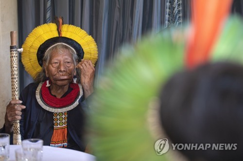 Chief Raoni Metuktire, leader of the Kayapo people a Brazilian Indigenous group and living symbole of the fight for preservation of the Amazon Rainforest, wait prior a meeting Mayor of the Geneva Sami Kanaan, at the Palais Eynard, in Geneva, Switzerland, 22 May 2019. EPA/MARTIAL TREZZINI