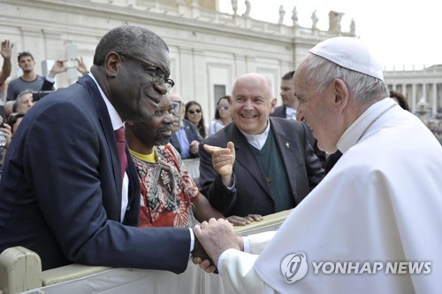 A handout picture provided by the Vatican Media shows Pope Francis (R) greeting Nobel Peace Prize laureate Congolese Dr. Denis Mukwege (L) during the general audience in St. Peter Square, Vatican City, 22 May 2019. EPA/VATICAN MEDIA HANDOUT HANDOUT EDITORIAL USE ONLY/NO SALES