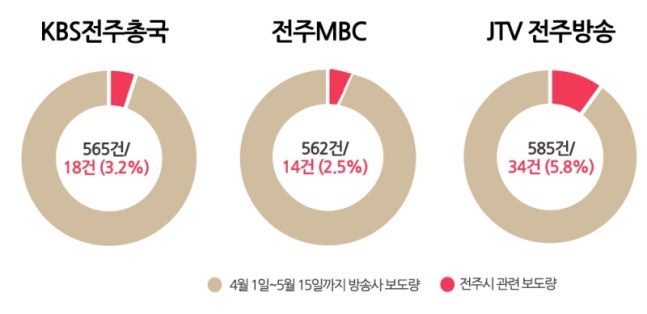 전북민언련이 분석한 결과 4월1일부터 5월15일까지 전북지역 방송3사 저녁 메인뉴스 중 전주시 관련 비판 보도는 JTV가 34건 중 33건으로, KBS전주총국의 18건 중 16건, 전주MBC의 14건 중 11건에 비해 2~3배에 달했다.
