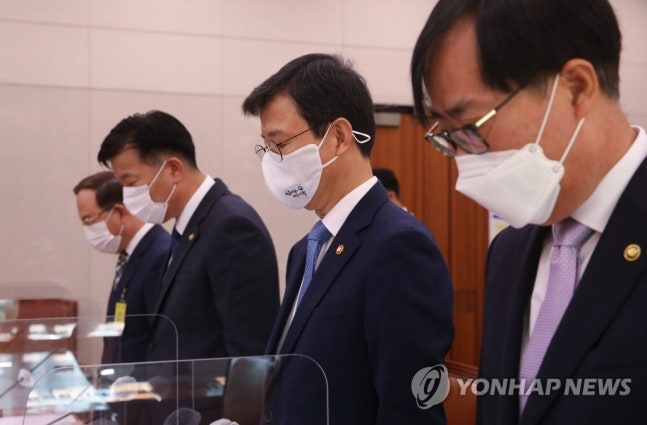 (서울=연합뉴스) 진성철 기자 = 문성혁 해양수산부 장관, 김홍희 해양경찰청장이 8일 오전 서울 여의도 국회에서 열린 농림축산식품해양수산위원회의 해양수산부에 대한 국정감사에서 북한군에 의해 사살된 해양수산부 소속 공무원에 대한 묵념을 하고 있다. 왼쪽부터 김병로 해양경찰청 차장, 김 해양경찰청장, 문 장관, 박준영 해양수산부 차관. 2020.10.8