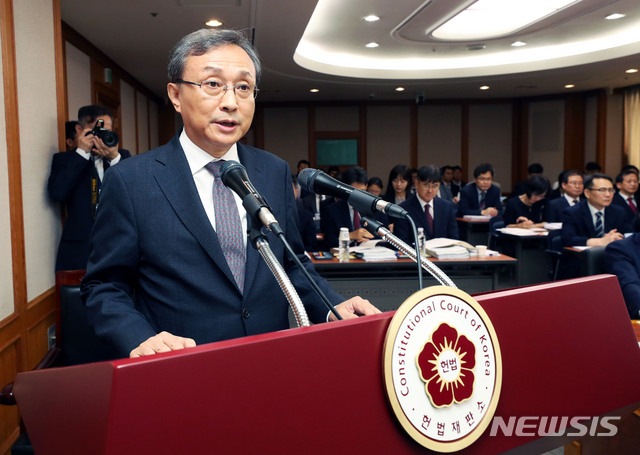 [서울=뉴시스]홍효식 기자 = 유남석 헌법재판소장이 지난해 10월4일 오전 서울 종로구 헌법재판소에서 열린 국회 법제사법위원회의 헌법재판소 사무처, 헌법재판연구원에 대한 국정감사에서 인사말을 하고 있다. 2019.10.04. [email protected][서울=뉴시스] 김재환 기자 = 유남석(63·사법연수원 13기) 헌법재판소장이 국민의 목소리를 빠짐없이 귀하게 듣는 헌법재판소가 되겠다고 말했다.