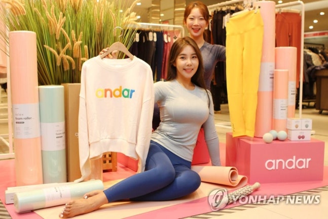 (서울=연합뉴스) 7일 서울 롯데백화점 소공동 본점 '안다르' 매장에서 모델이 행사 상품을 입고 포즈를 취하고 있다.