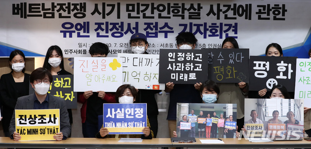 [서울=뉴시스] 이영환 기자 = 7일 오전 서울 서초구 서울지방변호사회관 인권실에서 열린 '베트남전쟁 시기 한국군에 의한 민간인학살 피해자 2인의 유엔특별절차 진정 기자회견'에서 참석자들이 구호를 외치고 있다. 2020.10.07.