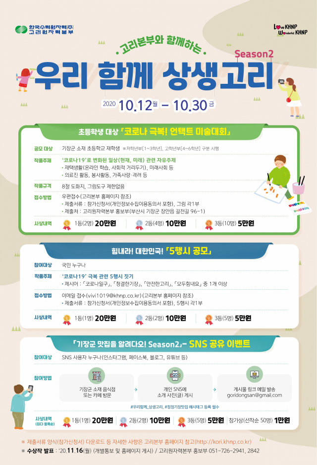 한국수력원자력㈜ 고리원자력본부(본부장 이신선)는 오는 12일부터 30일까지 지역사회 활성화 이벤트 ‘우리 함께 상생고리 시즌2’를 시행한다.