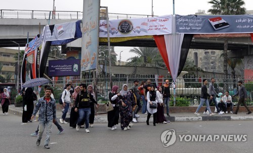 Egyptians walk in front of banners urging Egyptians to participate in the upcoming referendum for the constitutional amendments, Cairo, Egypt, 06 April 2019. According to reports, the Egyptian constitutional amendments referendum is expected to be held either on 20 April for Egyptians abroad and 21-22 April in Egypt or on the first week of May 2019. EPA/KHALED ELFIQI
