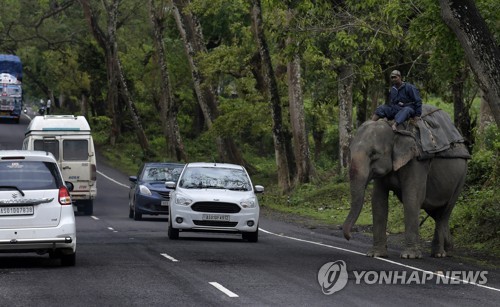 A mahout with his elephant waits to cross a national highway to another range inside the Kaziranga National Park in Golaghat district of Assam, India, 07 April 2019. EPA/STR