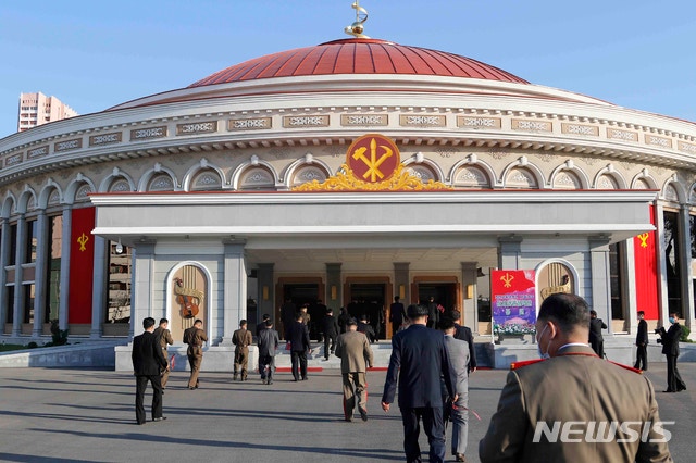 [평양=AP/뉴시스]8일 평양 삼지연 극장에서 조선노동당 창건 75주년을 축하하는 삼지연 관현악단의 공연이 열려 '조선노동당 창건 75돌 경축 대표'들이 공연을 관람하러 극장으로 들어가고 있다. 북한은 10일 조선노동당 창건 75주년을 맞는다. 2020.10.09.[서울=뉴시스] 김지현 기자 = 북한이 평양 주재 각국 대사관과 국제기구 대표부에 노동당 창건 75주년 기념행사 소식을 알리며 행사장 근처에 접근하지 말 것을 당부했다.