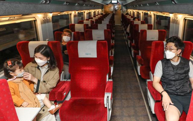 추석 연휴를 하루 앞둔 29일 오전 서울 용산구 서울역에서 부산행 KTX에 오른 류현민(32)·김희진(32)씨 부부와 딸 지안(3)양이 거리를 두고 앉아 열차 출발을 기다리고 있다. 올 추석 연휴기간 코로나19 확산 방지를 위해 열차 좌석 판매가 최대 50%로 제한되고 창가 좌석만 예매가 가능하다. 배우한 기자