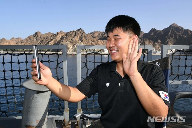 [서울=뉴시스]합참은 민족의 대명절인 추석을 맞아 해외파병부대 장병들의 부대 활동 모습을 1일 공개했다. 동명·청해·아크·한빛 각 부대별 장병들은 신종 코로나바이러스 감염증(코로나19) 상황속에서 감염 예방을 위해 외부활동이나 초청행사를 실시하지 않고 영내에서 다채로운 부대 활동을 했다. 사진은 군수품 보급을 위해 오만에 기항중인 청해부대32진 추기사 정현민 중사가 가족과 영상통화를 하는 모습. (사진=합참 제공) 2020.10.01.