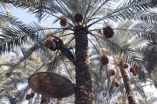 epaselect epa08719663 A farm worker climbs a palm tree to pick dates during the annual harvest season in Dahshour village, Giza, Egypt, 03 October 2020 (issued 04 October 2020). According to the UN Food and Agriculture Organization (FAO), Egypt is the world?s largest producer of dates with around 1.7 Million tons per year, which amounts to 17.7 percent of world?s production. However, Egypt is lagging among exporting countries with less than three percent of exports worldwide. Dates are eaten fresh or dried and can be pitted and stuffed with fillings such as almond. Other parts of the plants are also used to make functional items like ropes, baskets or even fishing boats. EPA/KHALED ELFIQI ATTENTION: This Image is part of a PHOTO SET
