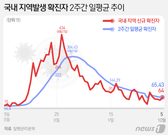 지역발생 추이는 9월 22일부터 10월 5일까지 '55→51→99→110→95→49→73→40→23→93→67→53→52→47→64명' 순을 기록했다. 최근 2주간 지역발생 일평균 확진자는 65.43명으로 35일만에 증가세로 돌아섰다.