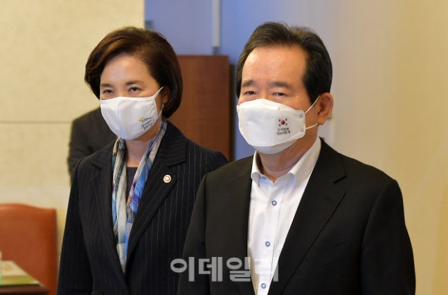 [이데일리 이영훈 기자] 정세균 국무총리(오른쪽)와 유은혜 사회부총리 겸 교육부 장관이 6일 오전 종로구 정부서울청사 국무회의실으로 입장하고 있다.