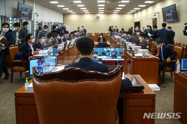 또, 코로나19 여파로 이번 국감이 제한된 상황에서 진행되면서 야당의 화력이 약해질 수 있다는 분석도 나온다. 코로나19 방역을 위해 국감장 내부엔 50명까지만 들어갈 수 있다. 참석자 모두 마스크를 착용하고, 투명 칸막이에 착석해 질의응답을 이어나갔다.