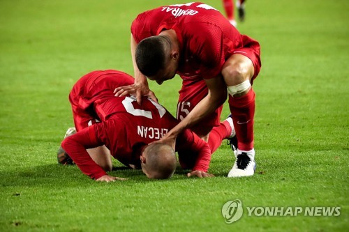 Turkey's Efecan Karaca (L) celebrates with his teammates after scoring the 2-2 equalizer during the international friendly soccer match between Germany and Turkey at Rheinenergiestadion in Cologne, Germany, 07 October 2020. EPA/FRIEDEMANN VOGEL