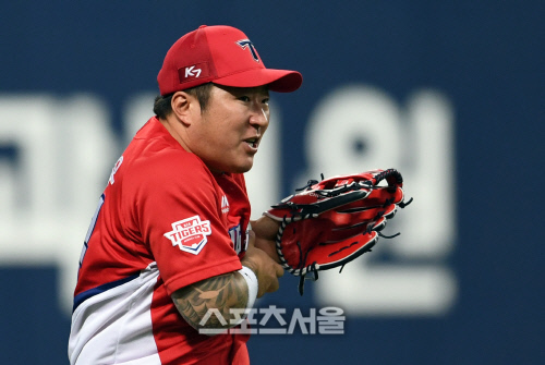 [포토]KIA 최형우, 공은 글러브 아닌 가슴에!