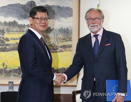 Kim and EU Ambassador to South Korea Michael Reiterer reaffirmed that close cooperation between the two sides is important to realize denuclearization of North Korea, according to the ministry.