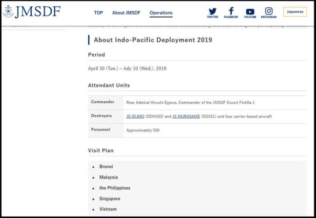 일본 해상자위대 홈페이지 - 브루나이, 말레이시아 등 인도 태평양 지역 전개훈련 계획이 올라와 있다.● 2019 인도-태평양 전개 훈련