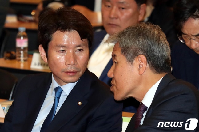 (서울=뉴스1) 이광호 기자 = 이인영 더불어민주당 원내대표와 김수현 대통령비서실 정책실장이 9일 오후 서울 중구 포스트타워에서 '문재인 정부 2년 경제,노동 정책의 성과와 과제'를 주제로 열린 정책토론회에 참석해 대화하고 있다. 2019.5.9/뉴스1