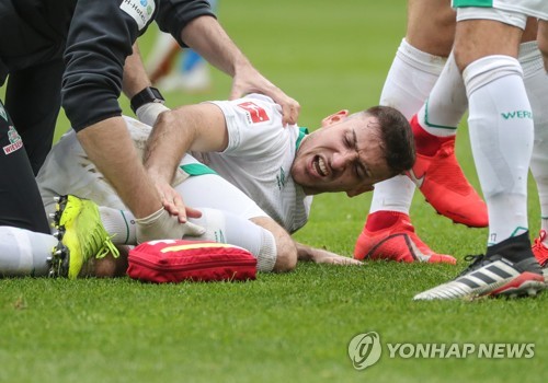 Bremen's Kevin Moehwald reacts in pain during the German Bundesliga soccer match between TSG 1899 Hoffenheim and SV Werder Bremen in Sinsheim, Germany, 11 May 2019. EPA/ARMANDO BABANI CONDITIONS - ATTENTION: The DFL regulations prohibit any use of photographs as image sequences and/or quasi-video