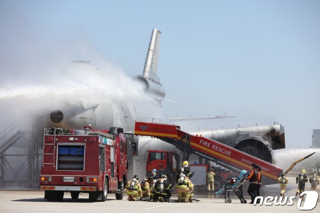 지난 21일 오후 인천공항 모형항공기 소방훈련장에서 항공기에 화재가 발생한 상황을 가정한 항공기 사고위기대응 종합훈련이 진행되고 있다. (인천공항 제공) 2019.5.22/뉴스1