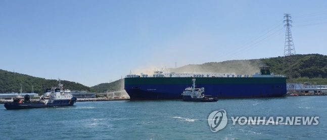 (울산=연합뉴스) 22일 오전 울산시 북구 현대자동차 울산공장 수출차량 이송용 대형 선박에서 불이 나 연기가 발생하고 있다. 2019.5.22 [울산해양경찰서 제공]