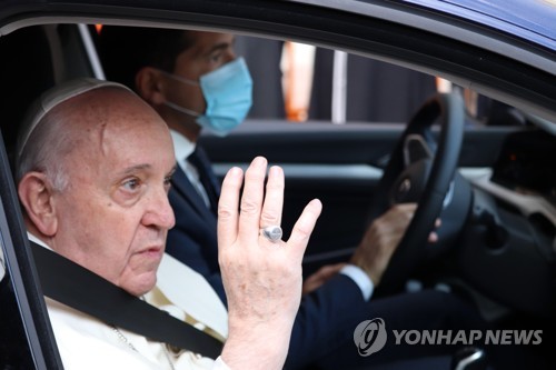Pope Francis waves from the seat of a car as he leaves the lower Basilica of San Francesco, in Assisi, Italy, 03 October 2020. In the basilica's crypt, near the tomb of the saint, the Pontiff is expected to celebrate mass and to sign his third encyclical, titled 'Fratelli tutti' ('All Brothers'). EPA/GIANLUIGI BASILIETTI