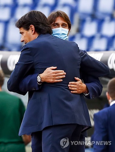 Lazio's head coach Simone Inzaghi (L) and Inter's head coach Antonio Conte prior to the Italian Serie A soccer match SS Lazio vs FC Inter at Olimpico stadium in Rome, Italy, 04 October 2020. EPA/ANGELO CARCONI