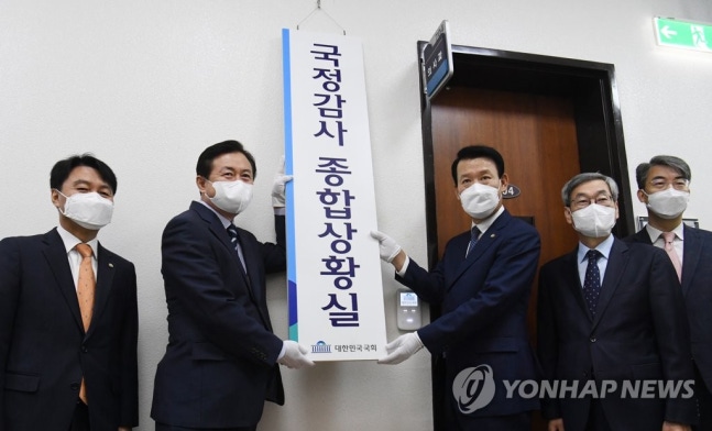 (서울=연합뉴스) 안정원 기자 = 김영춘 국회사무총장(왼쪽 두번째), 전상수 입법차장(왼쪽세번째) 등 국회 관계자들이 5일 오전 여의도 국회에서 '2020년도 국정감사 종합상황실' 현판식을 하고 있다. 2020.10.5