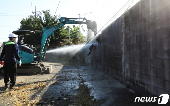 (인천=뉴스1) 정진욱 기자 = 인천시 관계자들이 6일 오전 인천시 부평구 미군기지(캠프마켓) 담장을 허물고 있다. 미군기지가 인천시민들에게 돌아오는 것은 81년만이다. 인천시는 해당 공간을 시민들에게 개방할 예정이다.2020.10.6/뉴스1