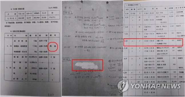 (광주=연합뉴스) 5·18민주화운동 당시 공군 수송기가 '김해~광주' 구간을 운항하며 시체를 옮긴 사실이 8일 드러났다. 육군본부가 작성한 '소요진압과 그 교훈' (왼쪽)에 나온 5월 25일 '김해-광주' 수송 기록에 따르면 비고란에 시체라는 한자가 적혀 있다. 공군이 5월 21일부터 29일까지 작성한 '5·18광주소요사태 상황전파자료'(가운데)에는 5월 25일 운항 내용이 수정액으로 삭제돼 있다. 육군본부가 1982년 2월 낸 '계엄사'(오른쪽) 문건에는 5월 25일 운항 사실이 누락돼 있다. 2019.4.8 [경향신문 제공]
