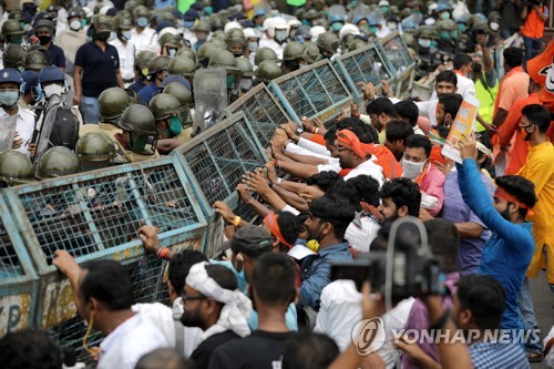 Bharatiya Janata Party (BJP) activists try to break police barricade during a march towards the Chief Minister office, Kolkata, Eastern India, 08 October 2020. Bengals opposition party BJP activists start their march from different points of Kolkata. They demand to the government, jobs for unemployed youth, transparent recruitment process and better law and order situation. EPA/PIYAL ADHIKARY