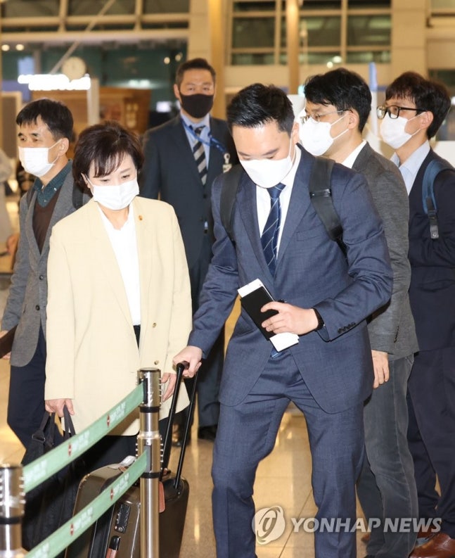 (영종도=연합뉴스) 홍해인 기자 = 최근 서거한 쿠웨이트 국왕에 대한 조문을 위해 김현미 국토교통부 장관을 단장으로 한 정부 조문사절단이 3일 밤 인천국제공항 제1여객터미널에서 출국하고 있다.