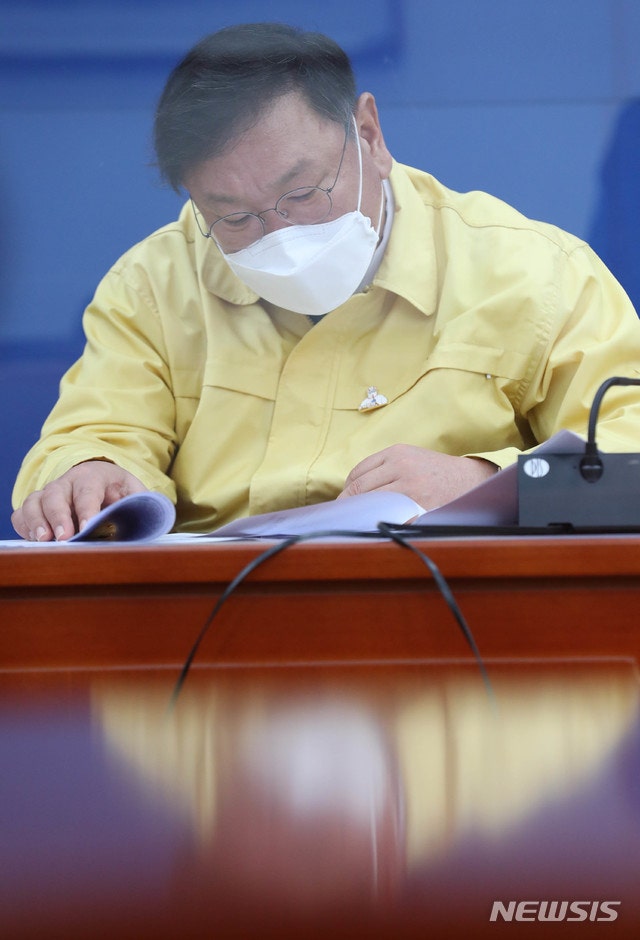[서울=뉴시스] 최동준 기자 = 김태년 더불어민주당 원내대표가 6일 오전 서울 여의도 국회에서 열린 국정감사 대책회의에서 회의 자료를 살펴보고 있다. (공동취재사진) 2020.10.06.