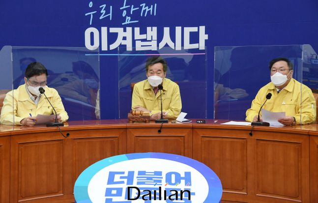 ⓒ데일리안 박항구 기자더불어민주당 김태년 원내대표가 7일 국회에서 열린 최고위원회의에서 발언하고 있다. 왼쪽부터 김종민 최고위원,이낙연 대표,김태년 원내대표.데일리안 박항구 기자 ([email protected])