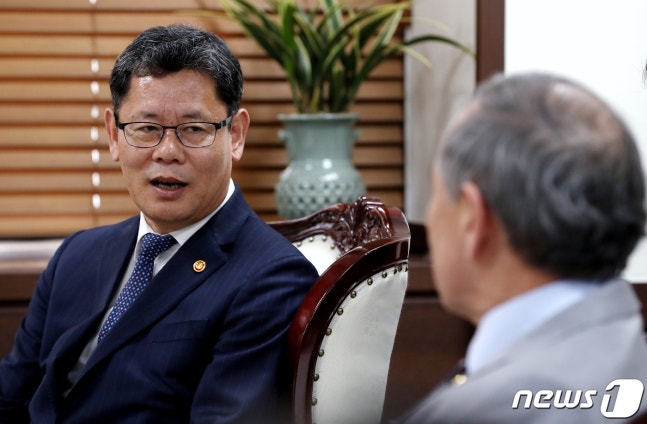 (서울=뉴스1) 박정호 기자 = 김연철 통일부 장관이 16일 오후 서울 종로구 세종대로 정부서울청사 집무실에서 해리 해리스 주한미국대사를 접견하고 있다. 2019.4.16/뉴스1
