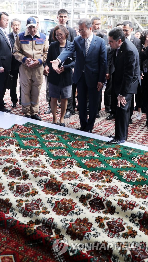 (투르크멘바시[투르크메니스탄]=연합뉴스) 한상균 기자 = 18일 오전(현지시간) 키얀리 가스화학플랜트에서 베르디무하메도프 대통령이 현장에 전시된 카페트를 문재인 대통령에게 선물하고 있다.
