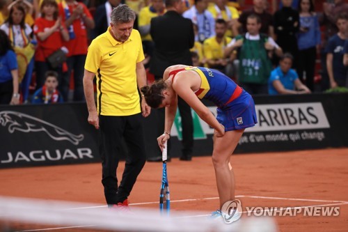 Irina-Camelia Begu (R) of Romania reacts with her coach Florin Segarceanu (L) after being injured during her game against Pauline Parmentier of France during the Fed Cup World Group, Semi Final between France and Romania, in Rouen, France, 21 April 2019. EPA/CHRISTOPHE PETIT TESSON
