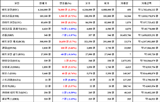 현재 암호화폐 거래소 "코인원"에 따르면 가상화폐 대장 격인 비트코인의 시세는 24시간 전 대비 76,000원(1.25%) 상승한 6,164,000원에 거래되고 있다.