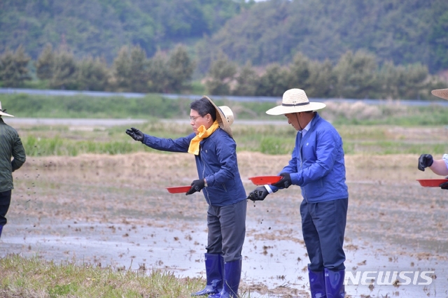 【여수=뉴시스】김석훈 기자 = 9일 전남 여수시 소라면 대곡마을 친환경유기단지에서 올해 첫 모내기 행사를 열리고 있다. 권오봉 시장이 논에 우렁이를 살포하고 있다. 2019.05.09. (사진=여수시청 제공)