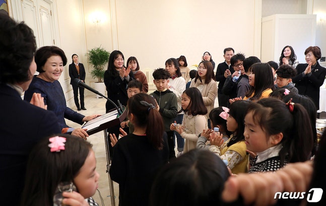 문재인 대통령 부인 김정숙 여사가 지난해12월 서광 지역아동센터 아동들과 관계자들을 청와대로 초대해 인사하고 있다.(청와대 제공) © News1