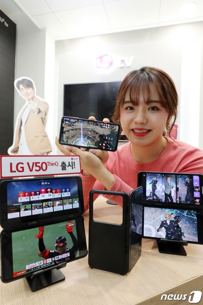 이날 출시한 'LG V50 씽큐'는 듀얼 스크린을 활용해 6종(프로야구, 골프, 아이돌 라이브, VR, AR, 게임) 5G서비스를 완벽히 즐길 수 있다. 2019.5.10/뉴스1