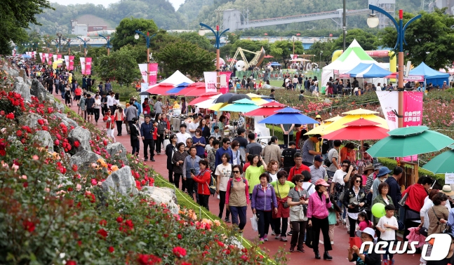(삼척=뉴스1) 서근영 기자 = 주말인 18일 강원도 삼척시 장미축제가 진행 중인 오십천 장미공원이 나들이 나온 시민과 관광객으로 북적이고 있다. 2019.5.18/뉴스1