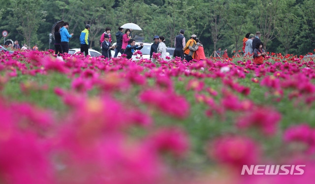【서울=뉴시스】 대체로 흐리고 오락가락 비가 내리는 19일 오전 경남 함양군 상림경관단지를 찾은 관광객들이 활짝 핀 작약꽃과 양귀비꽃을 구경하고 있다. 2019.05.19. (사진=함양군 제공)
