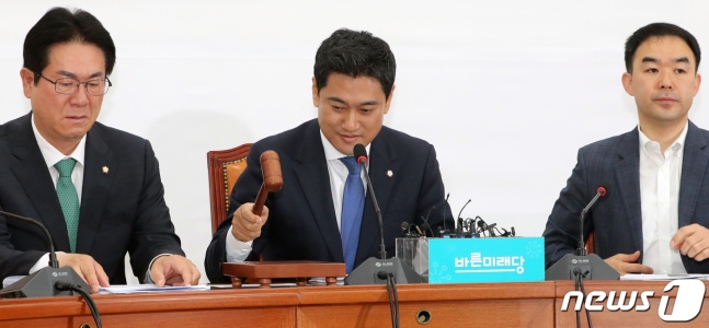 (서울=뉴스1) 이종덕 기자 = 오신환 바른미래당 원내대표가 23일 서울 여의도 국회에서 제43차 원내정책회의를 주재하고 있다. 오신환 원내대표는 23일 "쟁점 법안이 패스트트랙에 올라간 상황에서 더 이상 시간을 끌면 자유한국당만 불리하다"며 한국당의 국회 등원을 촉구했다. 2019.5.23/뉴스1