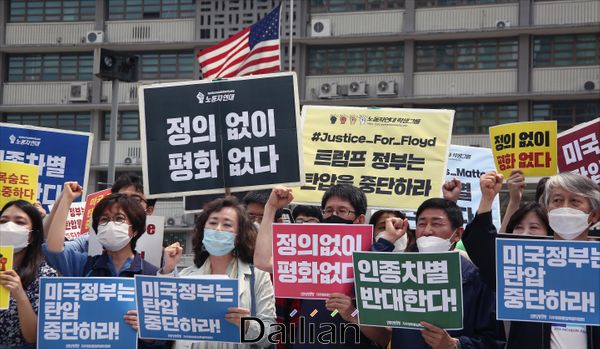 ⓒ데일리안 홍금표 기자미국 흑인 사망 항의 운동 연대 관계자들이 5일 서울 세종대로 광화문광장에서 미국 정부 규탄 긴급 기자회견을 갖고 있다.데일리안 홍금표 기자 ([email protected])