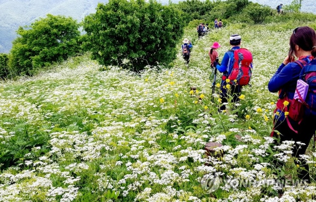 (태백=연합뉴스) 배연호 기자 = 7일 강원 태백시 대덕산 정상(약 1천300m)에 야생화인 전호(田湖)꽃이 만개해 장관을 이루고 있다. 2020.6.7