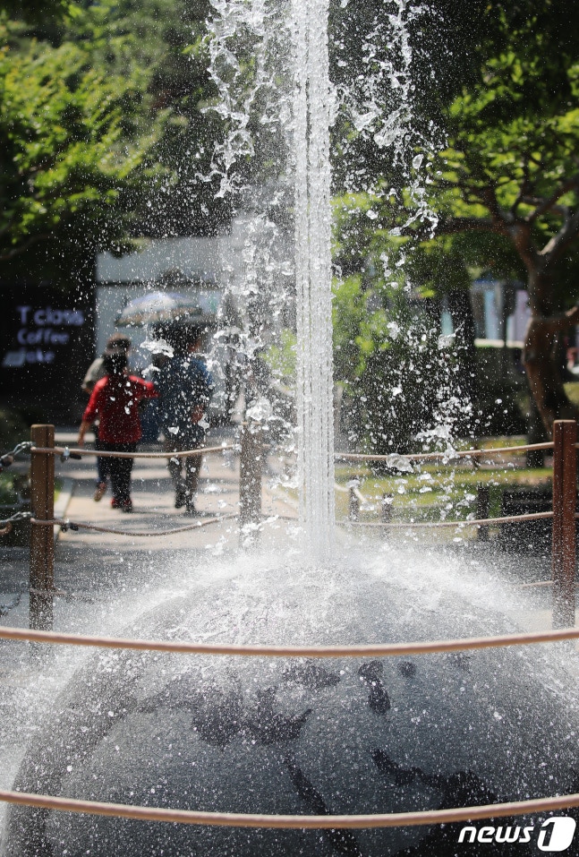 대구의 낮 최고기온이 35.4도까지 오르며 폭염이 계속된 8일 대구 중구 2.28기념중앙공원의 분수가 시원한 물을 뿜어 올리고 있다. 2020.6.8/뉴스1 © News1 공정식 기자