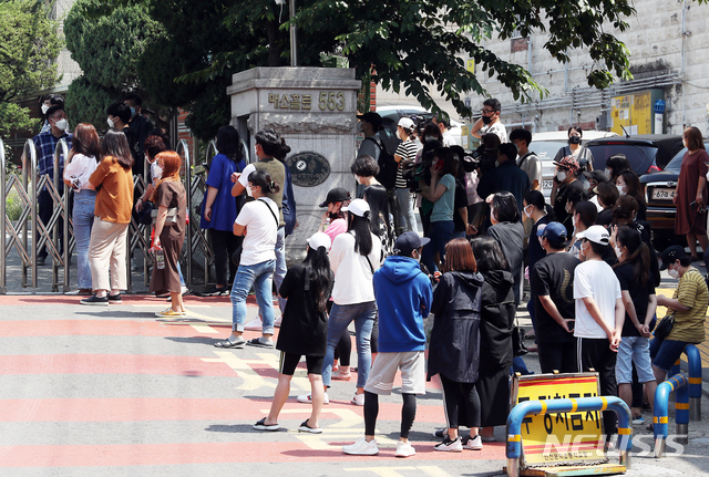 [인천=뉴시스] 이종철 기자 = 인천지역에 신종 코로나바이러스 감염증(코로나19) 확진자가 속출한 9일 오전 확진자가 나온 인천시 미추홀구 한 초등학교에 워크 스루(Walk through) 선별진료소가 설치되어 나머지 재학생들을 검사하고 있는 동안 학부모들이 교문 밖에서 걱정스러운 표정으로 지켜보고 있다. 2020.06.09.