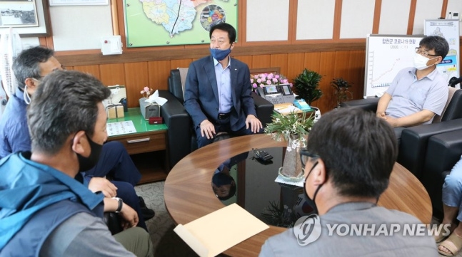 (합천=연합뉴스) 박정헌 기자 = 9일 오후 경남 합천군청에서 문준희 합천군수가 경남 시민단체 '적폐청산과 민주사회 건설 경남운동본부'와 일해공원 명칭 변경과 관련한 간담회를 하고 있다. 2020.6.9